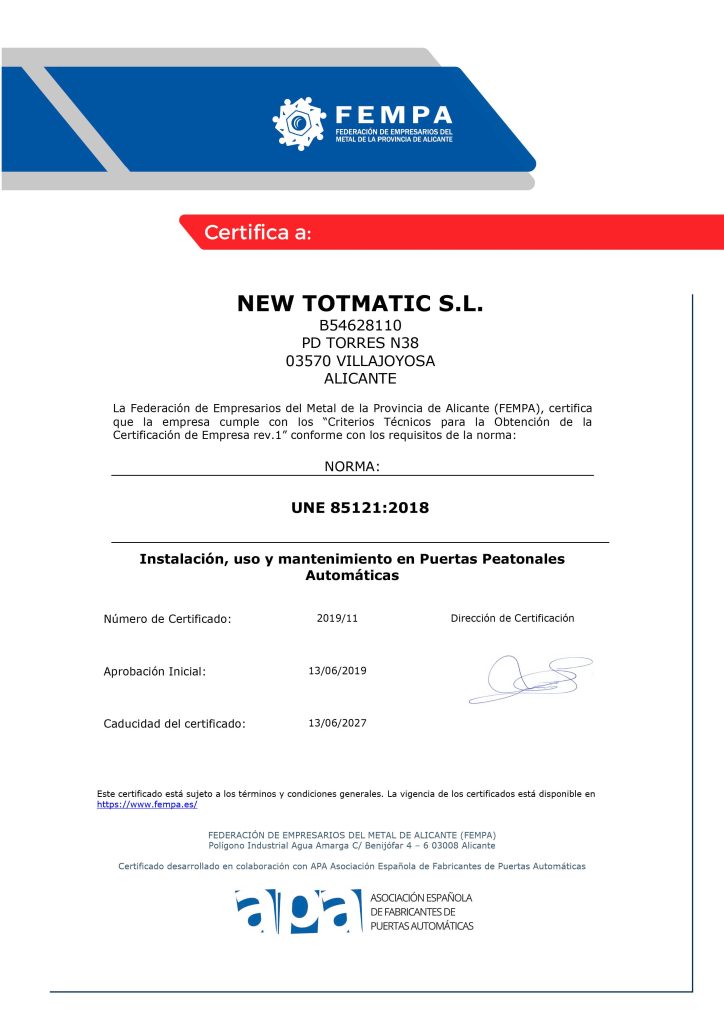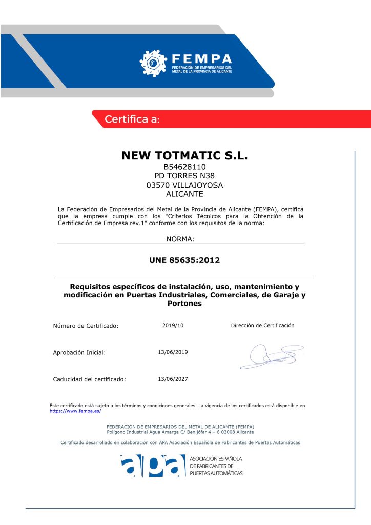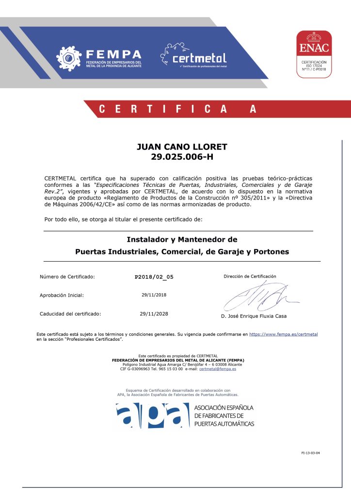 Servicio técnico especializado para la revisión, reparación y certificación de puertas automáticas según normativa C.E.