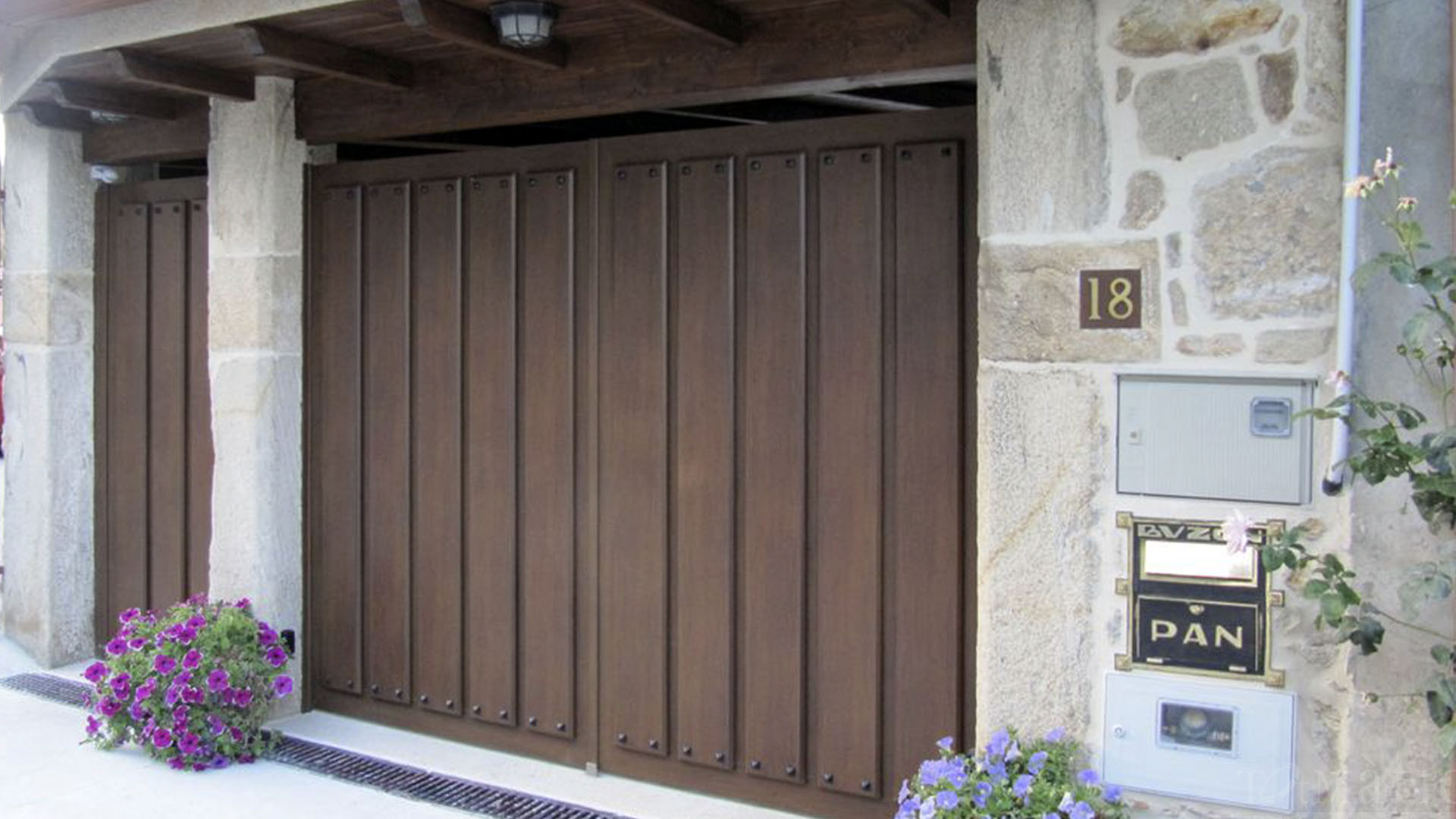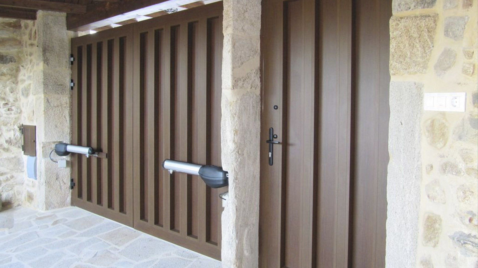 Las posibilidades de personalización son amplísimas: combinaciones de lamas de 200 mm, tubos decorativos, opciones con o sin portón peatonal, y una extensa carta de colores RAL, incluyendo imitaciones en tonos madera.